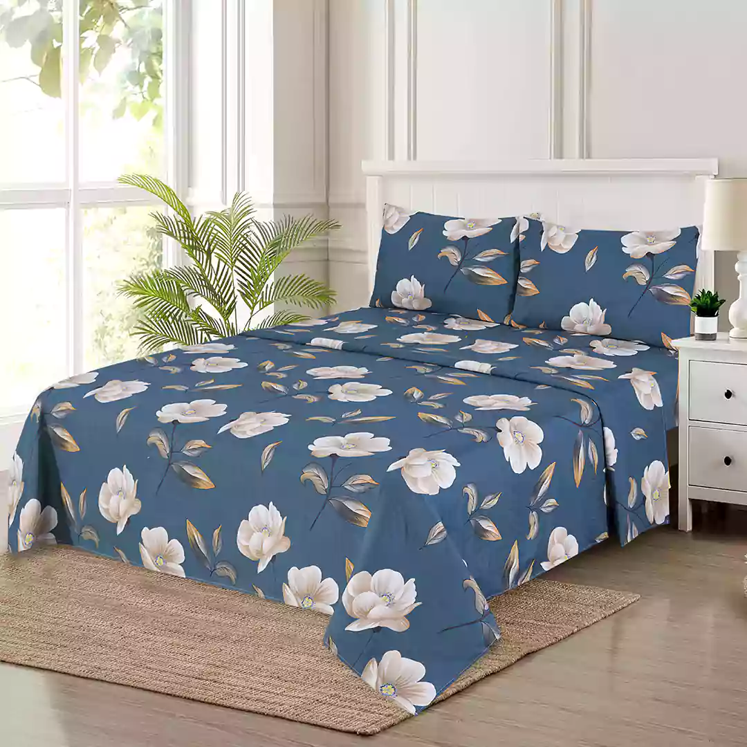 Add a touch of freshness and elegance to your bedroom with our Blue & White Floral Printed 4 Pcs Bedsheet Set. Crafted from soft, breathable, and durable fabric, this set combines comfort with a charming floral design for a relaxing sleep experience.
