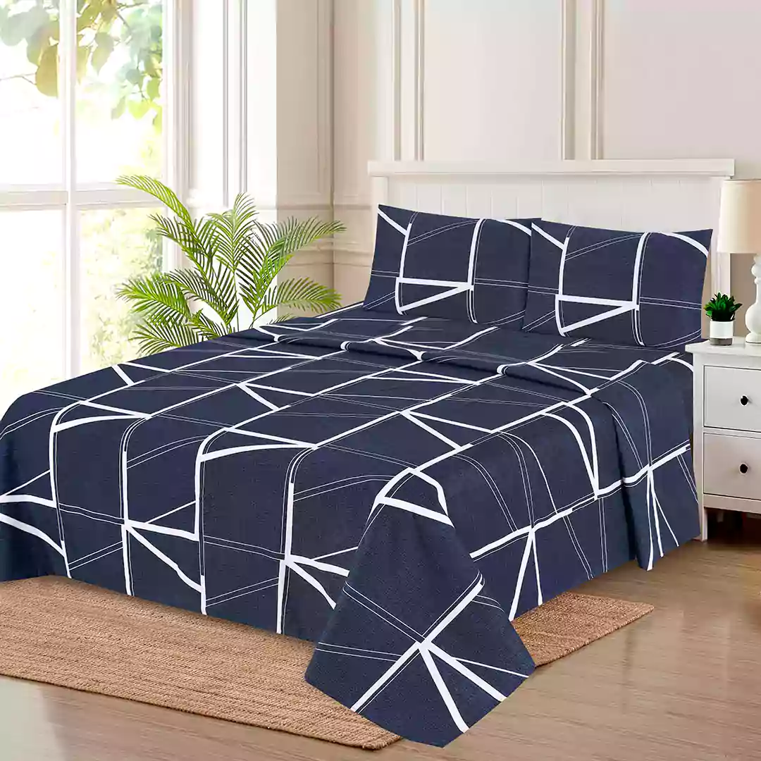 Bring a classic and elegant touch to your bedroom with our Navy Blue & White Lines Printed 4 Pcs Bedsheet Set. Made from premium-quality, soft, and breathable fabric, this set ensures both comfort and style for a peaceful night’s sleep.