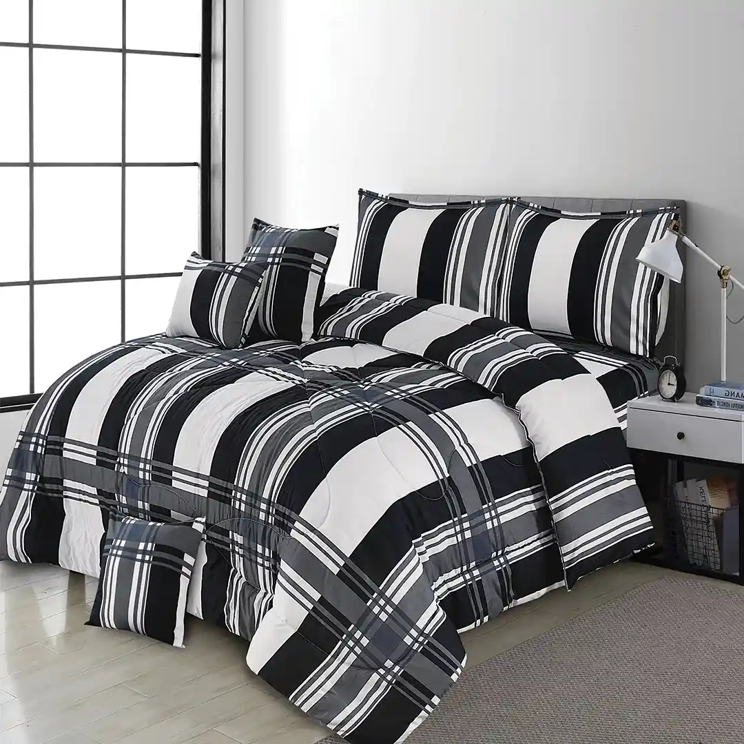 Upgrade your bedroom with our Black & White Plaid Printed 7 Pcs Comforter Set, designed for a perfect blend of comfort and style. Made from premium, soft, and breathable fabric with a cozy filling, this set adds a modern and timeless touch to your space.
