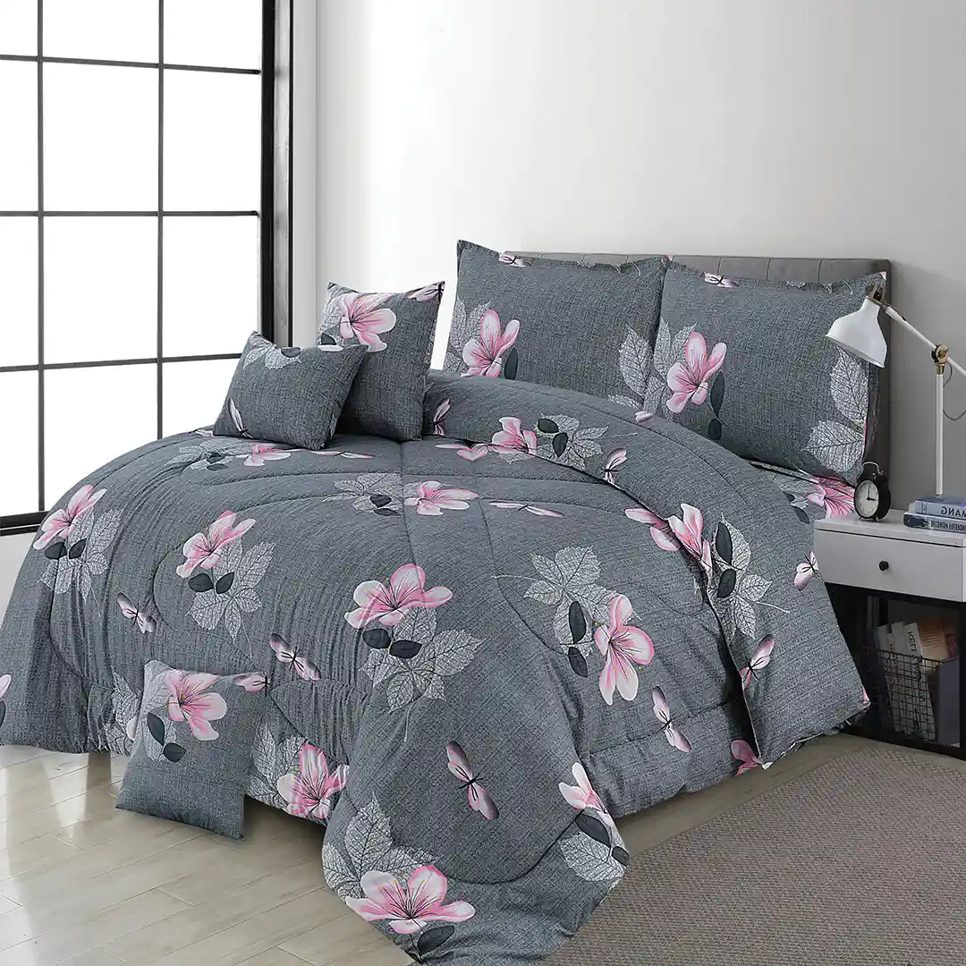 Add elegance and comfort to your bedroom with our Grey & Pink Floral Printed 7 Pcs Comforter Set. Crafted from premium, soft, and breathable fabric with a plush filling, this set blends cozy warmth with a graceful floral design to enhance your space.