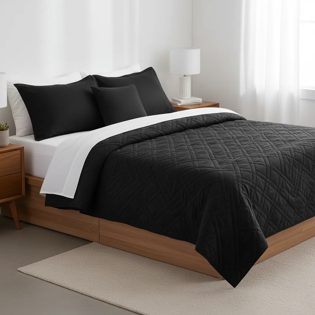 Black Diamond Plain Quilt Bedding Set adds a bold, modern touch to your space with its deep black tone and elegant diamond-stitched texture. Made from premium cotton or microfiber fabric and filled with lightweight padding, it offers breathable, cozy comfort suitable for all-season use.
