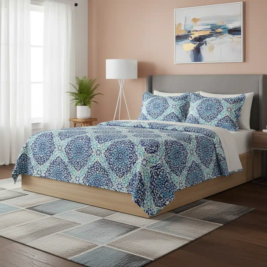 The Blue Medallion Printed Quilt adds a refreshing, artistic touch to your bedroom with its beautiful medallion-inspired pattern in soothing blue tones. Made from soft cotton or microfiber fabric with lightweight filling, it offers breathable, cozy comfort throughout every season.