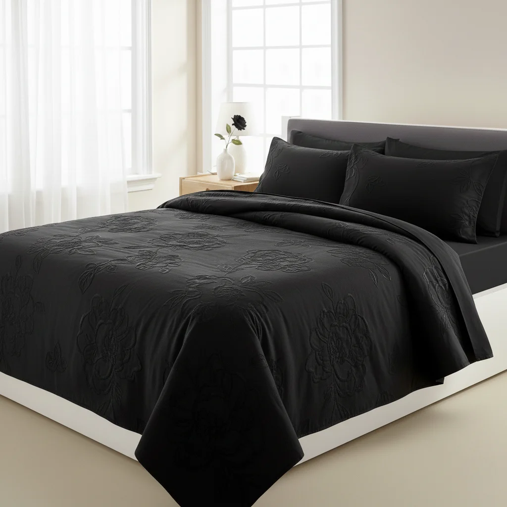 The deep black base paired with a delicate floral-textured pattern adds a stylish, sophisticated touch, making it ideal for contemporary interiors. Its versatile design works beautifully in master bedrooms, guest rooms, boutique hotels, and furnished apartments looking for a bold yet refined look.