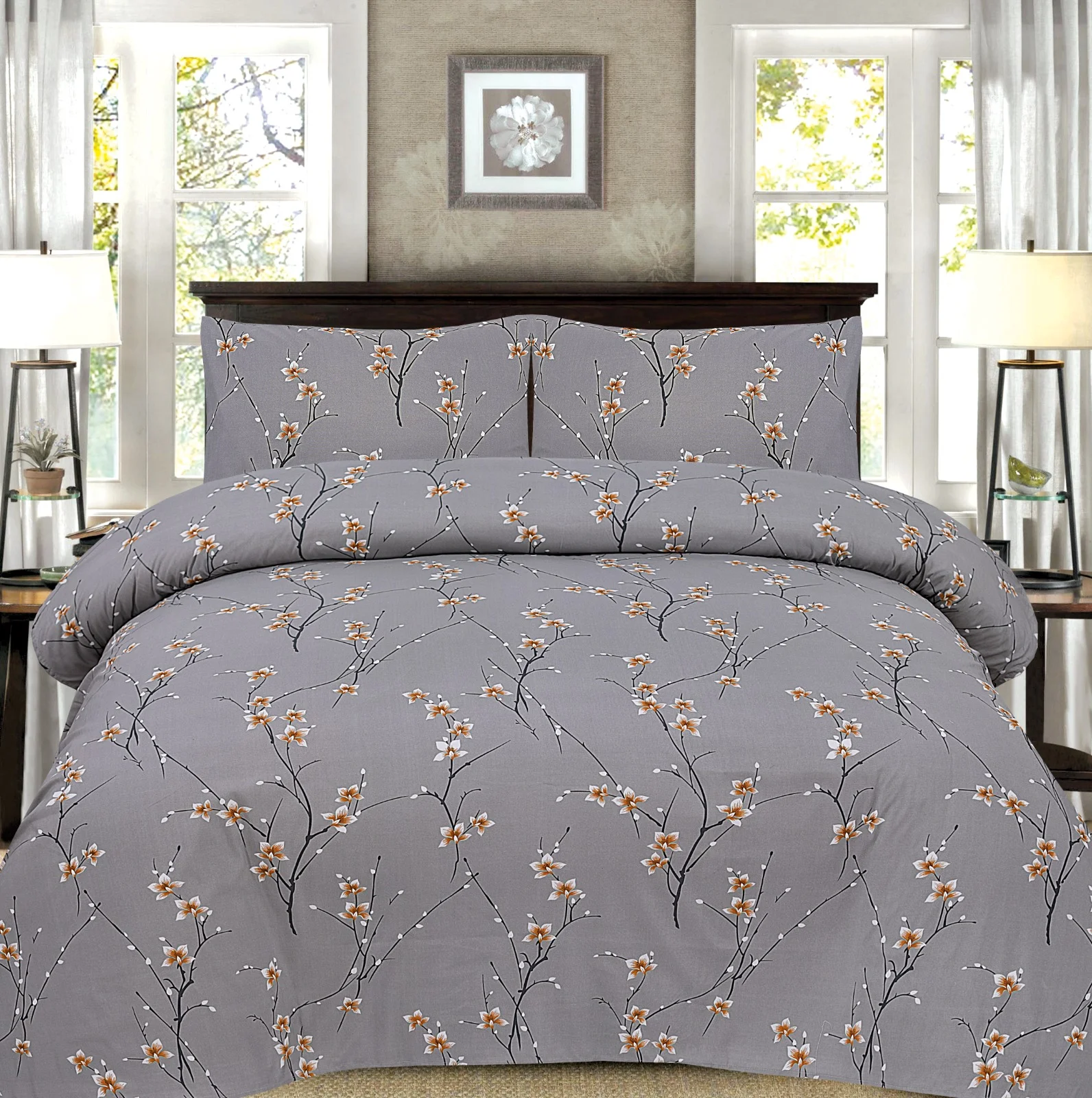Grey Blossom Branch Printed Duvet brings a subtle, elegant charm to your bedroom with its soft grey tones and delicately detailed blossom branch design. Crafted from premium cotton or microfiber fabric, this duvet cover provides a smooth, breathable, and lightweight feel—perfect for cozy, all-season comfort.
