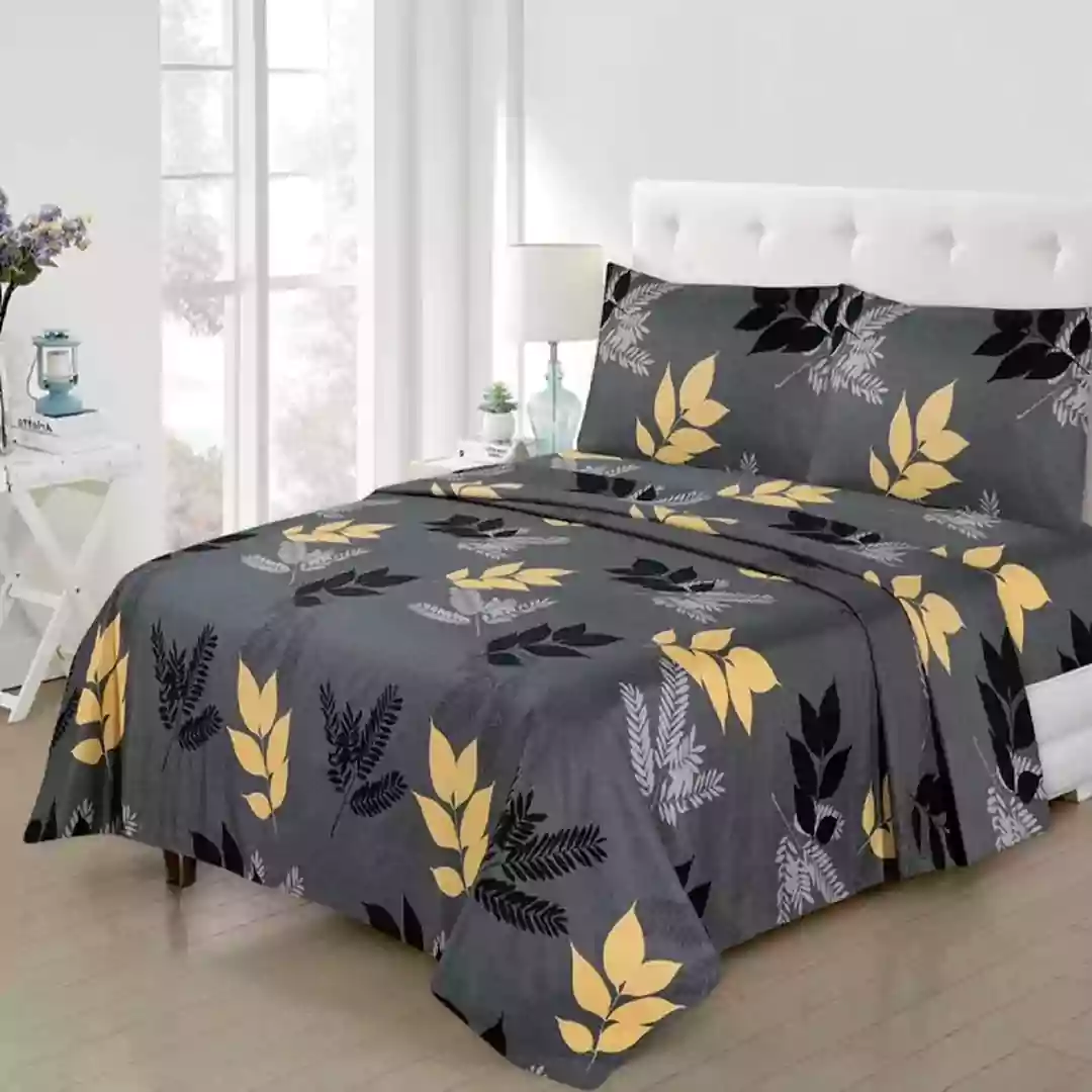 4 Pcs Botanical Print Set – Yellow & Grey Bed Sheets