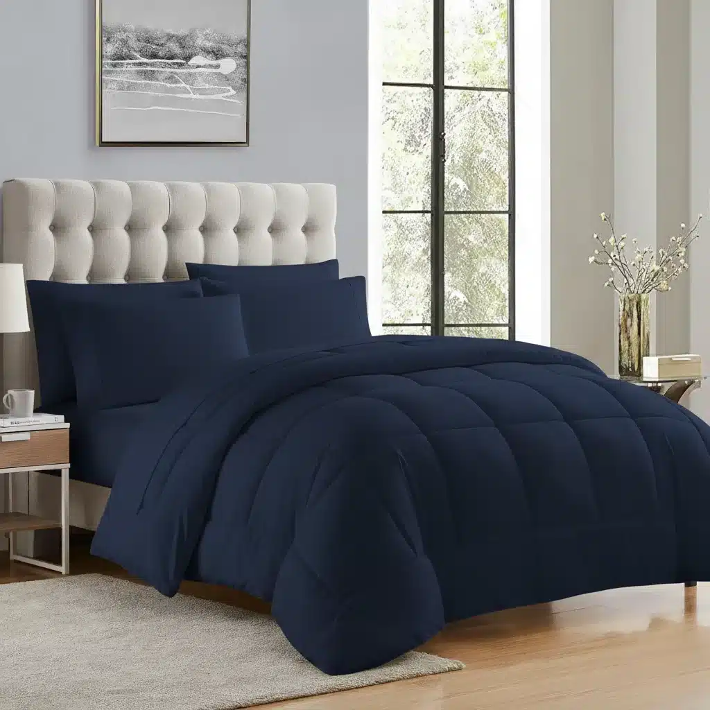 Navy Blue Box Stitch Plain Comforter Set brings a refined, modern elegance to your bedroom with its deep navy blue shade and clean box-stitched plain design. Crafted from premium microfiber or cotton-blend fabric and filled with soft, plush padding, this comforter set offers warm, breathable, and lightweight comfort—perfect for cozy sleep throughout all seasons.