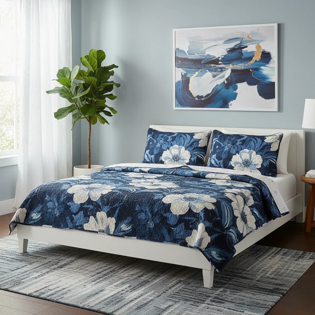 Our Navy Blue Printed Floral Quilt Set combines softness, warmth, and elegant design, making it a beautiful addition to any bedroom. Crafted with premium cotton or microfiber fabric and filled with lightweight padding, this quilt set ensures year-round comfort while keeping you cozy.