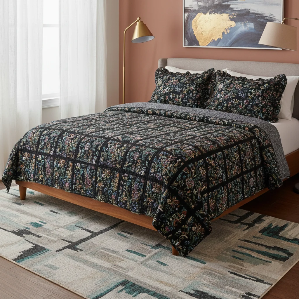 The Black Printed Dark Floral Quilt Set combines elegance and sophistication, making it a perfect addition to any bedroom. Crafted from soft cotton or microfiber fabric with lightweight filling, it provides cozy, breathable comfort for all seasons.